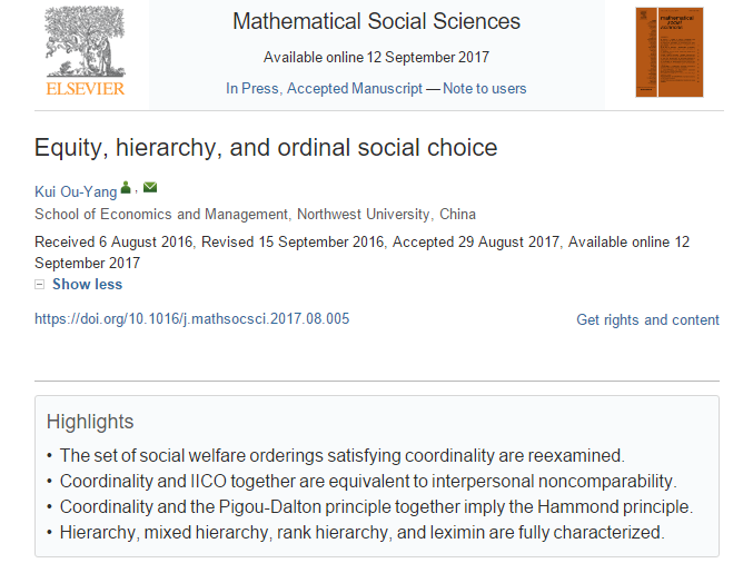 新葡的京官网数理经济与统计学系欧阳葵副教授的独著论文《Equity, Hierarchy, and Ordinal Social Choice》被国际知名SSCI&SCI双索引期刊《Mathematical Social Sciences》接收并已在线发表:
