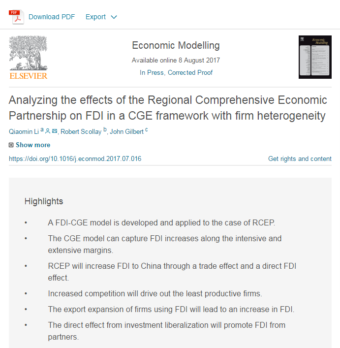 新葡的京官网世界经济与贸易系教师李侨敏博士的论文《Analyzing the effects of the Regional Comprehensive Economic Partnership on FDI in a CGE framework with firm heterogeneity》在SSCI检索期刊《Economic Modelling》上在线发表,论文链接:http://www.sciencedirect.com/science/article/pii/S0264999317301773 。