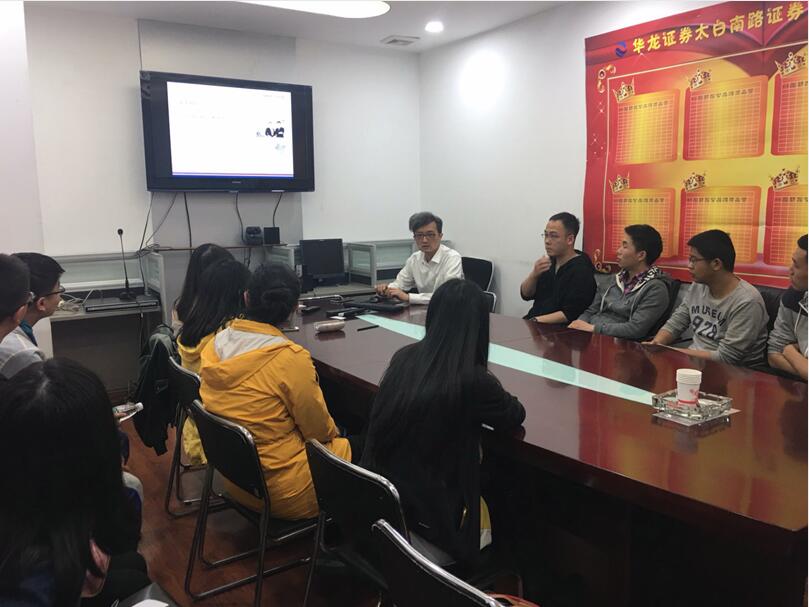25名学生参观了公司的办公区,并与公司的首席培训师何洪军进行了座谈。何经理详细介绍了公司的发展历程、组织结构、经营范围、主体业务、人才招聘等情况,并就实体经济发展与证券交易的关系、国家宏观政策对证券市场的影响等主题与学生进行了交流,学生们也就自己感兴趣的经济学问题与何经理进行了深入的交流与探讨。