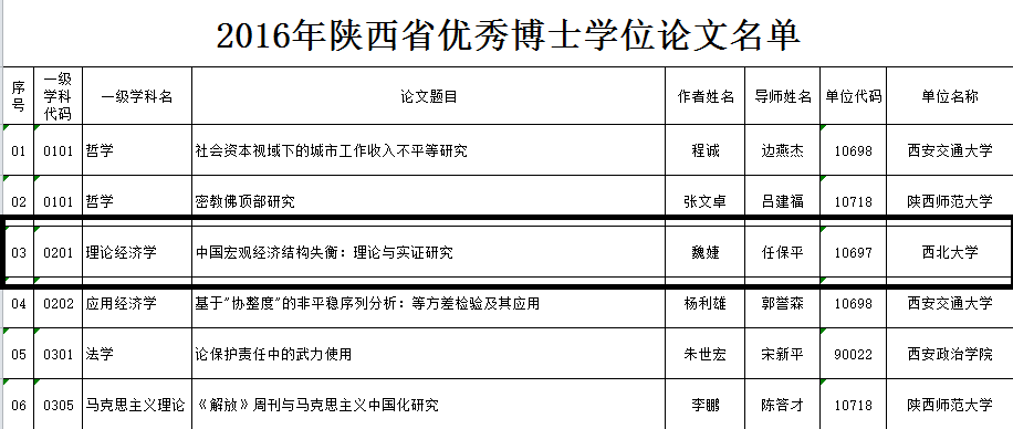 近日,2016年陕西省优秀博士学位论文评选结果揭晓。经学位授予单位推荐、专家通讯评议和专家会议评审,新葡的京官网青年教师魏婕博士在导师任保平教授指导下撰写的学位论文《中国宏观经济结构失衡:理论与实证研究》被评为“陕西省优秀博士学位论文”。该论文是全省“理论经济学”学科唯一获奖文章。此前,该论文还曾被北京当代经济学基金会评为首届“中国经济学优秀博士论文”。