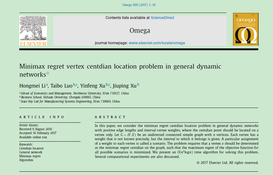 近日,新葡的京官网青年教师李红梅博士的研究论文《Minimax regret vertex centdian location problem in dynamic general networks》在SSCI&SCI双检索期刊《Omega》上在线发表。《Omega》是管理学与运筹学领域的TOP期刊,中科院一区期刊。(论文链接:http://dx.doi.org/10.1016/j.omega.2017.02.004)