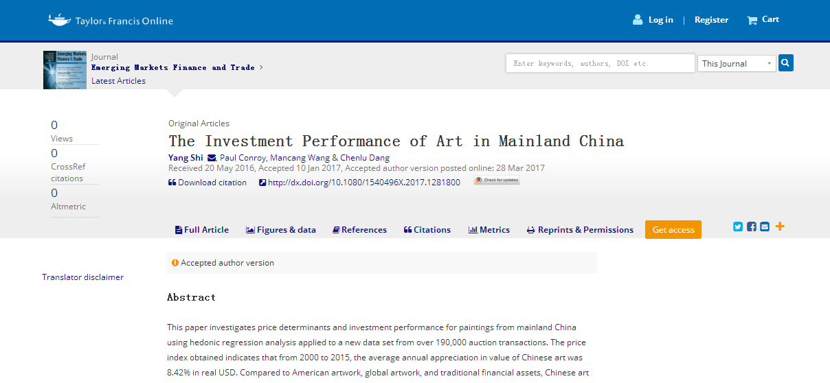 近日,新葡的京官网青年教师石阳博士和王满仓教授等的研究论文《The Investment Performance of Art in Mainland China》在SSCI检索期刊《Emerging Markets Finance and Trade》上在线发表。该期刊的影响因子在344种经济学SSCI期刊中排名第186位。(论文链接:http://www.tandfonline.com/doi/abs/10.1080/1540496X.2017.1281800?journalCode=mree20)