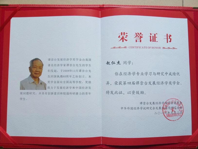 第四届谭崇台发展经济学奖学金的申报评审工作于2016年3月正式启动,经个人申请、导师推荐、所在院系鉴定,谭崇台发展经济学奖学金委员会在审定申奖资格并进行初步筛选的基础上,邀请中国人民大学、南京大学、中山大学、北京大学、华中科技大学等单位知名学者组成评审委员会,对申奖材料进行评审并投票表决。最终,新葡的京官网硕士生赵仁杰与南开大学、武汉大学、华中科技大学、暨南大学的其他5名同学获此殊荣。