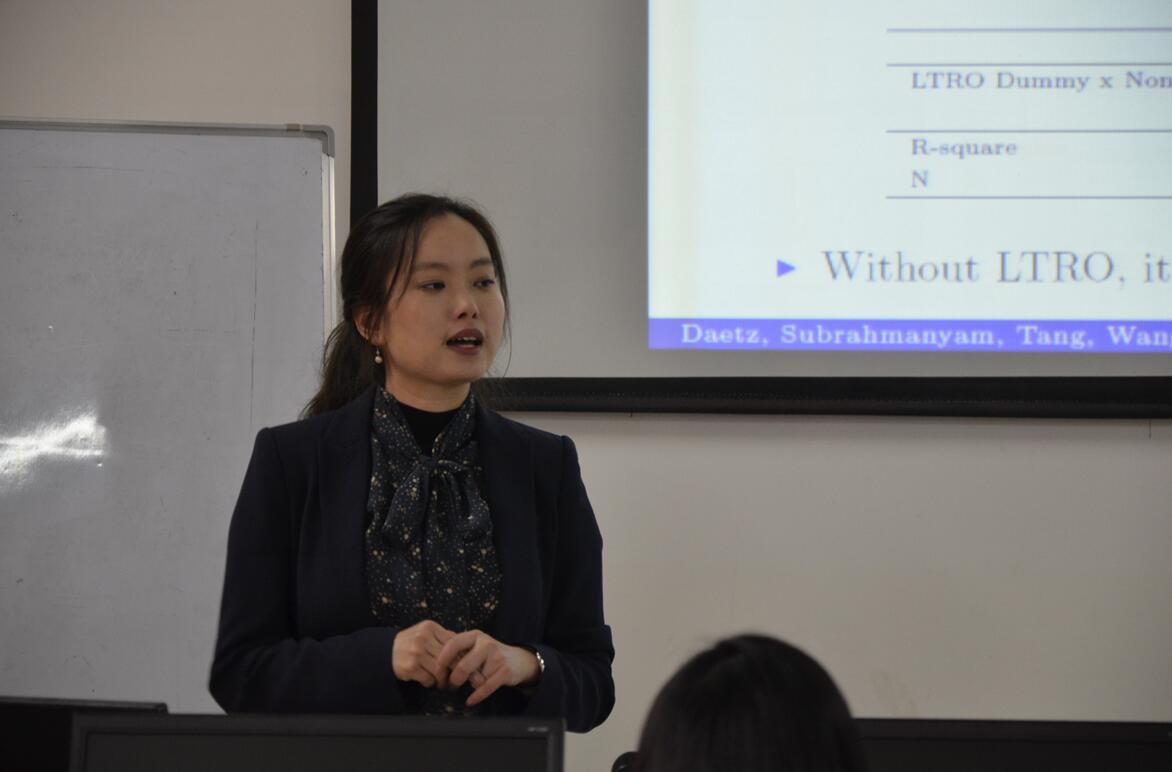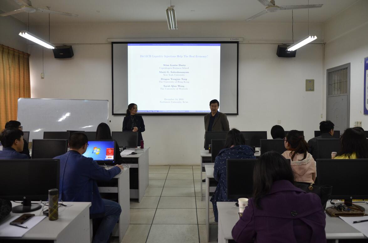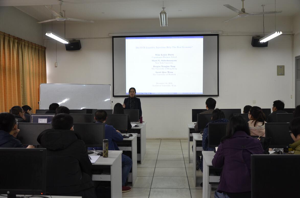 经济类教师学术沙龙2016年第4期(总第82期)于2016年12月14日下午在新葡的京集团35222vip长安校区8110教室举行。任教于英国华威大学的王倩博士应邀以《欧洲央行的流动性注入如何影响实体经济》为题,向参加活动的学院师生作了报告。本次沙龙由金融系副主任王峰虎副教授主持,金融系俞颖副教授点评,多名青年教师及新葡的京官网部分硕士研究生参加了本次沙龙。