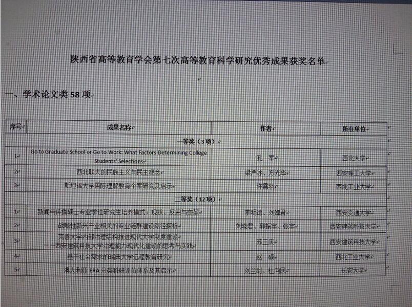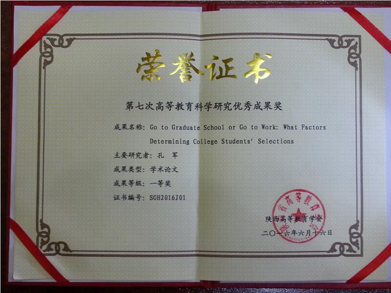 新葡的京官网孔军副教授的论文《Go to Graduate School or Go to Work: What Factors Determining College Students’Selections?》获得陕西省第七次高等教育科学研究优秀成果奖一等奖,在12月3日举行的陕西省高等教育学会年会暨校长论坛上受到表彰。这篇文章在SSCI检索期刊The Anthropologist上发表(2015, Vol.19(3), pp.773-780)。