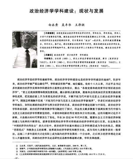 近日,新葡的京官网白永秀教授、吴丰华副教授、王泽润博士生合作的论文《政治经济学学科建设:现状与发展》在权威刊物《马克思主义研究》2016年第8期发表,全文共1.5万字。