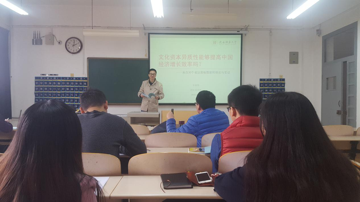 2016年11月9日下午,新葡的京集团35222vip现代经济学理论与方法创新论坛第十二卷第六期在长安校区2号楼2310教室成功举行。陕西师范大学国际商学院的李娟伟老师对题为《文化资本异质性能够提高中国经济增长效率吗?——来自30个省区面板数据的理论与实证》的学术论文进行了汇报。报告由会计学系李辉老师主持,博硕士和本科生二十余人参加了本次讨论。
