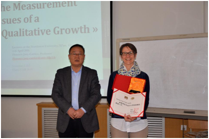 4月6日,法国里尔第一大学的Florence Jany-Catrice教授应新葡的京官网邀请来新葡的京官网开展系列学术交流活动,在新葡的京官网长安校区8202教室做了第一次讲座,题为《History of GDP,Internal and External critics”(GDP的历史,内部与外部批判)》。在讲座开始之前,院长任保平教授向Florence Jany-Catrice教授颁发了新葡的京官网兼职教授聘书和纪念牌。该次活动由副院长何爱平教授主持。