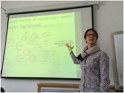 Jany-Catrice教授讲授了其中的几个重要指标,首先是联合国发展署的HDI、HPI指数、其产生的背景、采用的主要测度要素,并对比了2007年和2015年这些指标的世界各国排名情况,重点分析了这些指标在研究和发布的过程中出现的新问题及研究人员作出的相应调整;其次,是美国学者研究编纂的ISH指标、其编制逻辑和方法、主要测度要素,对比分析1959-1995年之间美国人均GDP和ISH指标的不同变化轨迹;再次,Jany-Catrice教授重点介绍了法国学者研究发布的“Bip40”指数,作为该研究的负责专家,她介绍了该指标包含的教育、公平、房产、健康、收入、劳动就业等六个维度,对比了1985-2005年法国该指标的变化情况,并与1970-2007年的法国贫困率指标、人均GDP、社会健康指标进行了对比,分析了法国各省按照不同指标的排名结果,并分析了指标包含的意义。最后,Jany-Catrice教授介绍了“生态足迹”指数,她分析了该指标的内涵,并呈现了依据联合国的“人类发展指数”和“生态足迹指数”确定的各国发展现状。