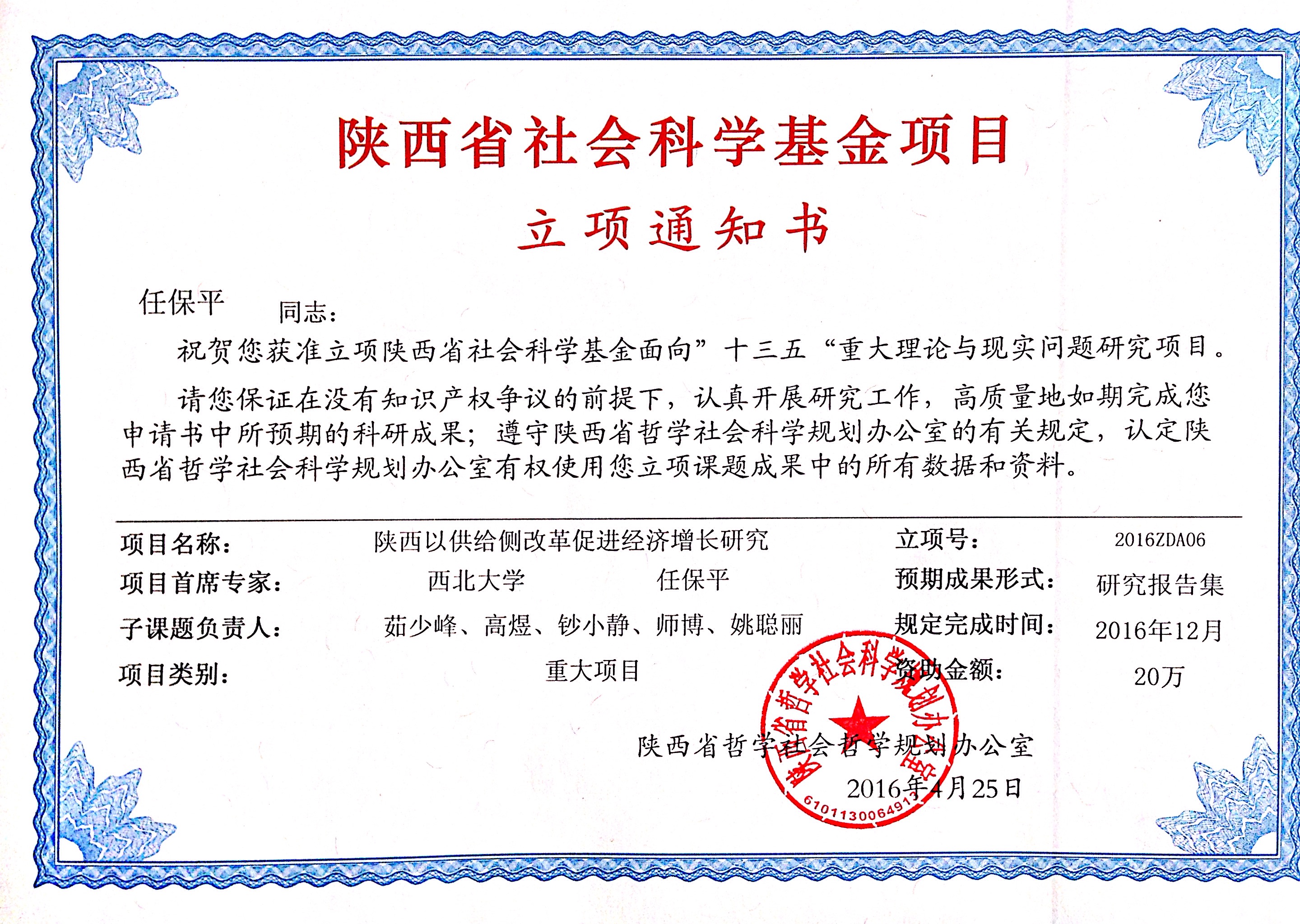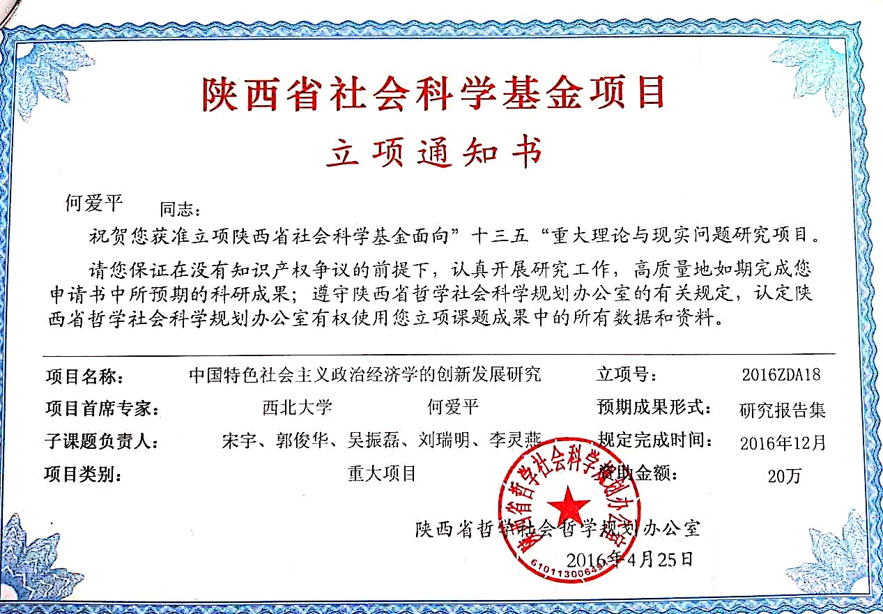 经陕西省哲学社会科学规划领导小组批准,新葡的京官网任保平教授主持的“陕西以供给侧改革促进经济增长研究”以及何爱平教授主持的“中国特色社会主义政治经济学的创新发展研究”立项为陕西省社会科学基金面向“十三五”重大理论与现实问题研究项目。