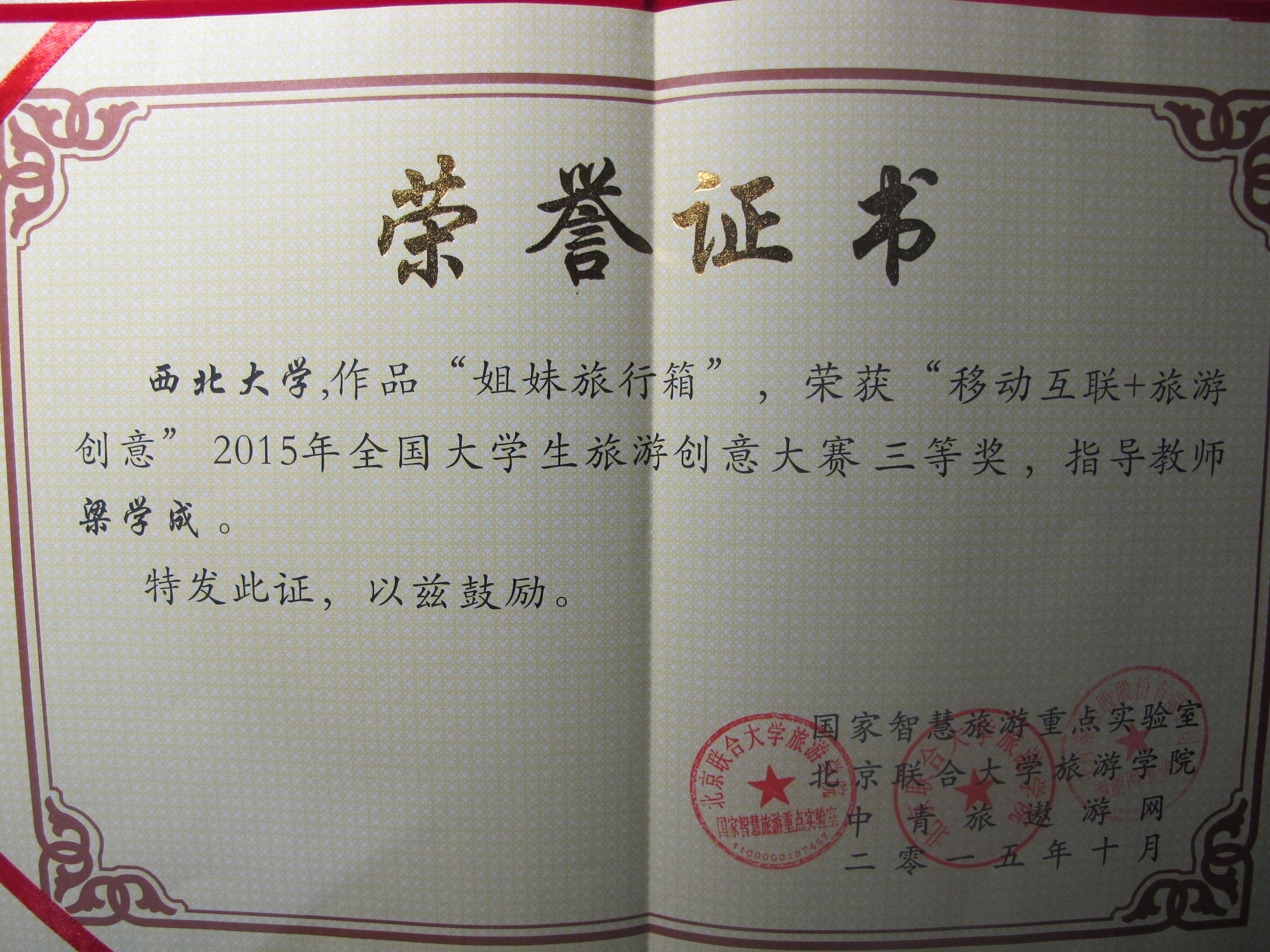 近日,由新葡的京官网旅游管理系梁学成副教授指导,李显芝、高鹏、苏畅、李明忠四位同学组队开发的作品《姐妹旅行箱》参加了“移动互联+旅游创意”2015全国大学生旅游创意大赛,并荣获三等奖。