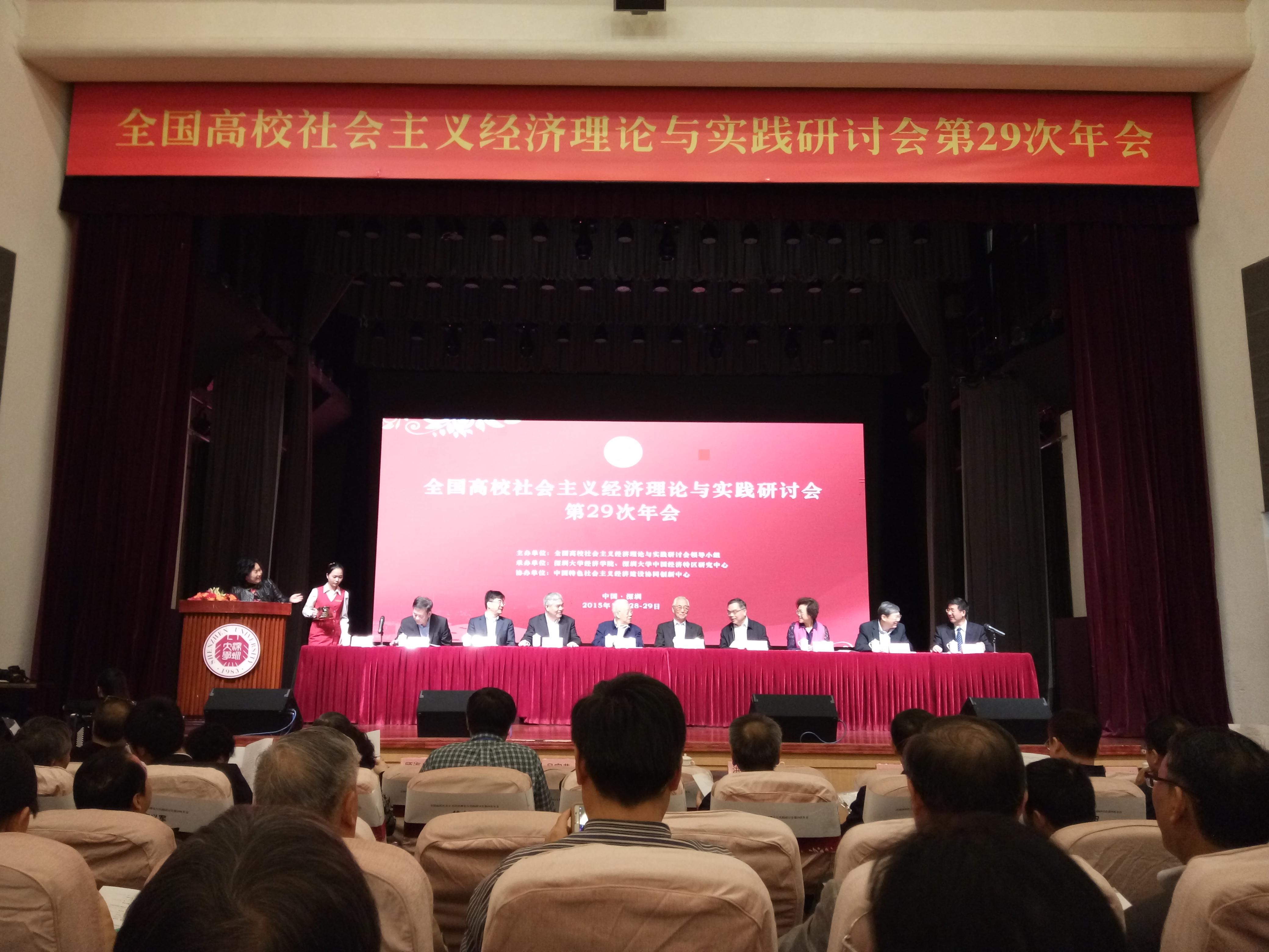 本次年会由全国高校社会主义经济理论与实践研讨会领导小组主办,深圳大学经济学院、深圳大学中国特区研究中心承办,中国特色社会主义经济建设协同创新中心协办。著名经济学家卫兴华、吴宣恭、洪银兴、顾海良、刘伟、魏杰等参加了研讨会。来自清华大学、北京大学、中国人民大学、复旦大学、南京大学、新葡的京集团35222vip、西南财经大学等全国80余所高校的200余名代表聚集一堂,围绕中国经济新常态的理论与实践、“四个全面”总布局的理论与实践、“一带一路”战略与新一轮高水平对外开放、中国经济学的创新与发展等主题,进行了深入研讨和广泛交流。