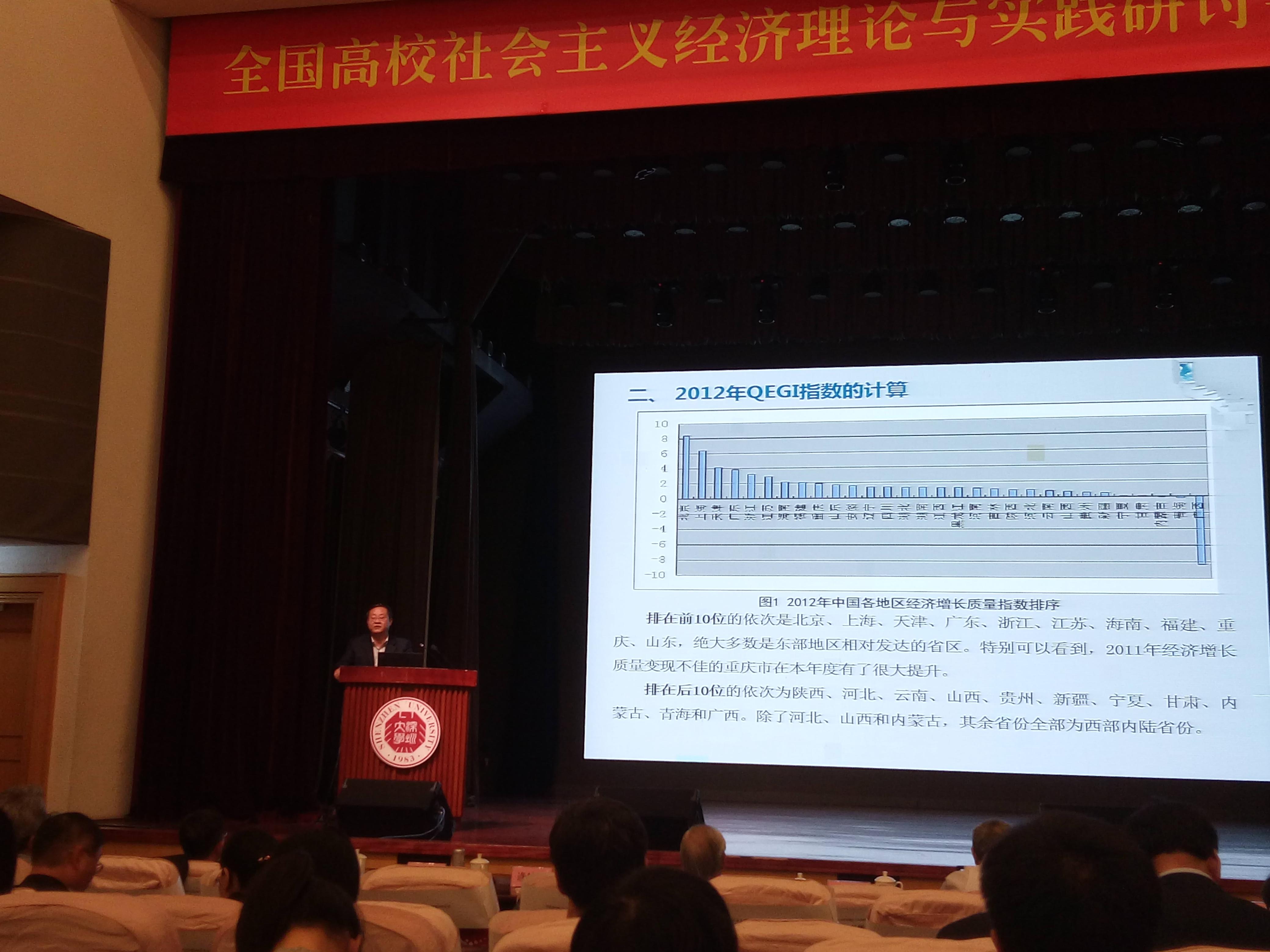 2015年12月21日-22日,全国高校社会主义经济理论与实践研讨会第29次年会在深圳大学召开,新葡的京官网院长任保平教授、何爱平教授与青年老师吴丰华、郭晗博士受邀参加了本次年会。任保平教授在大会上做了“进入新常态后的中国经济增长质量”的主题发言。