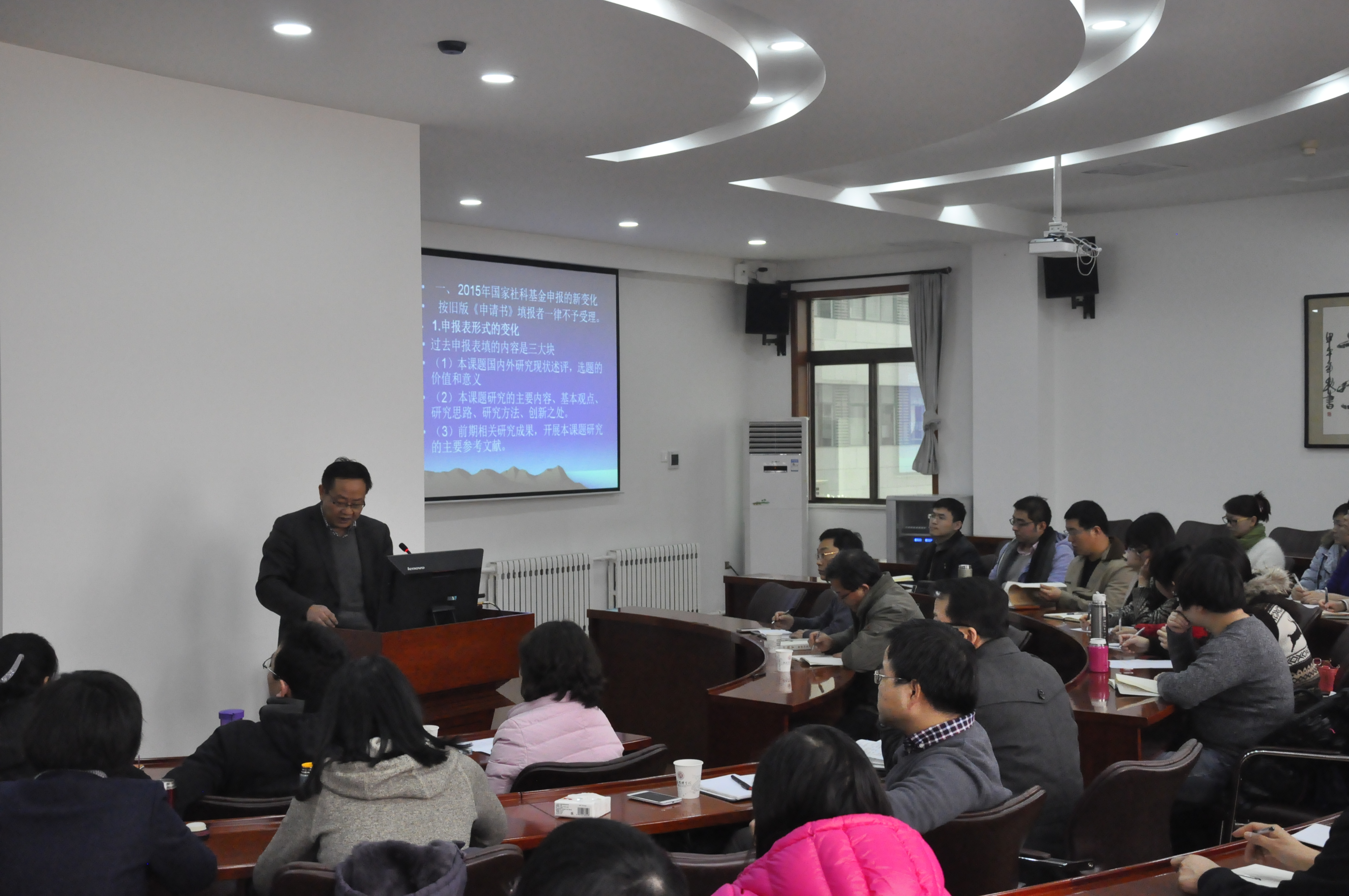 刘丰处长首先对新葡的京集团35222vip在2015年取得的丰硕科研成果表示祝贺,然后分析了近年来社科基金申报的注意事项。刘丰处长强调申报国家社科基金需要以课题指南为基础,但必须紧扣国家宏观经济、政治的各项方针,以顶天立地的精神展开科学研究。最后刘丰处长推荐大家阅读和学习《习近平谈治国理政》,并激励各位老师通过坚持不懈的奋斗必将迎来成功。