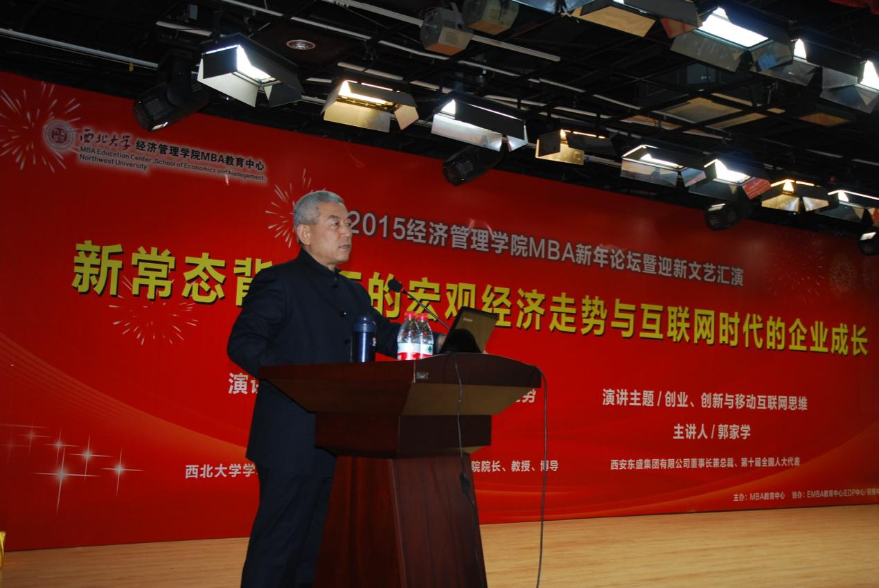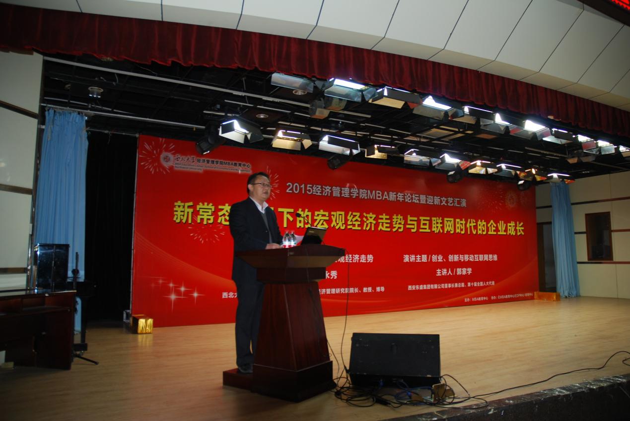 2015年1月18日,由MBA教育中心主办,EMBA教育中心、高级管理培训中心、硕博中心协办的2015年MBA新年论坛在长安校区多功能报告厅举行。本次论坛邀请白永秀教授、新葡的京集团35222vipMBA杰出校友、西安东盛集团有限公司董事长郭家学围绕“新常态背景下宏观经济走势和移动互联时代企业成长”的主题做了精彩演讲,院长任保平教授主持论坛。出席论坛的还有MBA联合会代表、EMBA联合会代表、学院教师以及MBA、EMBA学员共400余人。