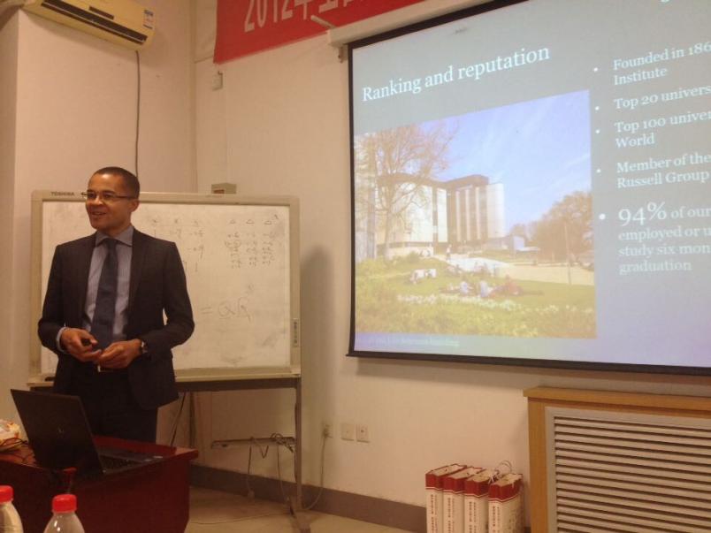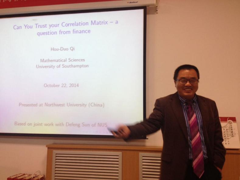 当天下午,代表团来新葡的京官网开展了学术交流,活动由金融系副主任王峰虎副教授主持。Houduo Qi副教授、博士作了“Can You Trust Your Correlation Matrix—A question from finance”的学术报告。齐教授介绍了这项研究从实践到理论的产生背景,分享了其研究团队解决金融数据处理中相关性问题的新算法。该算法程序大大缩短了处理数据时所需时间,已被NAG(Numerical Algorihms Group)收入文库,并已应用于许多顶尖的世界级金融公司。随后,该校国际处东亚地区主任Jon Inegbedion先生介绍了该校的学科设置及世界排名等情况,并重点介绍了硕士研究生培养的“1+1+1”国际交流项目,该项目为我校研究生提供了获取英国南安普顿大学和新葡的京集团35222vip双硕士学位的宝贵机会。新葡的京官网40余名研究生和部分老师参与了讲座并就相关问题进行了深入交流。