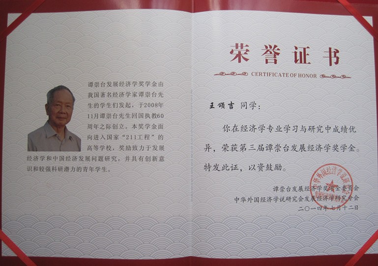 谭崇台先生是我国当代著名经济学家,他从20世纪80年代开始主编发展经济学系列著作,被公认为将西方发展经济学系统引入中国的“第一人”。谭崇台发展经济学奖学金创立于2008年11月,该奖学金面向进入国家“211工程”的高等学校,奖励致力于发展经济学和中国经济发展问题,并具有创新意识和较强科研潜力的青年学生,自2010年起每两年颁发一次。