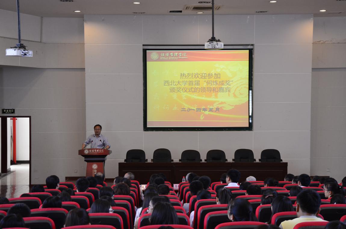 院长任保平在主持仪式时,向出席本次颁奖仪式的各位领导和嘉宾表示了热烈欢迎和诚挚的感谢,对何炼成教授多年来扎根西部、潜心学术、教书育人的精神及多年来为新葡的京集团35222vip经济学科和新葡的京集团35222vip的发展所作出的贡献给予高度评价。他说,“何炼成奖”是在学校和上级部门的关心和支持下,由政治经济学专业1977级、1978级毕业生和经管学院共同发起并出资,各级校友积极响应,经多年的积极筹备,于2014年1月设立的。该奖的设立,是为了弘扬何炼成教授的崇高师德和治学精神,鼓励经济管理学科优秀学生和青年教师积极投身学习和研究,全院师生要秉承优良传统、坚持科学发展,励精图治、锐意进取,以追求一流的气魄、脚踏实地的姿态,认真履行新葡的京集团35222vip人才培养、科学研究、服务社会等职能,向着更加高远的目标迈进。