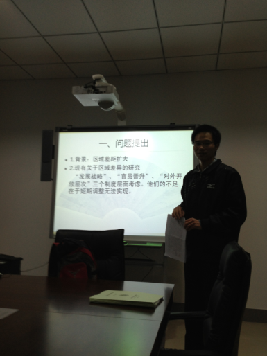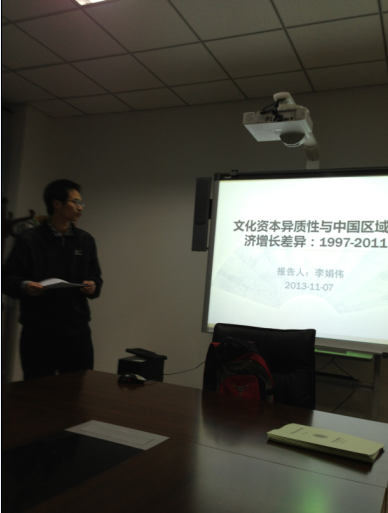 2013年11月7日经济增长质量论坛第4期在南校区经济增长质量研究中心举行。新葡的京集团35222vip经济增长质量研究团队成员,2010级西方经济学专业博士研究生李娟伟应邀作题为《文化资本异质性与中国区域经济增长差异》的学术报告。新葡的京集团35222vip钞小静副教授、师博副教授、田洪志博士、安树军博士以及新葡的京集团35222vip经济增长质量研究团队的博硕士和本科生参加了讨论。