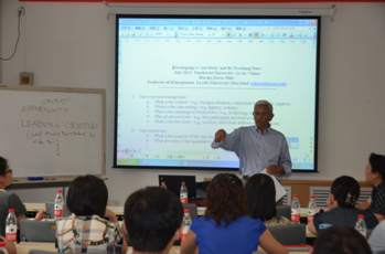 Desai教授以“Developing a Case Study and Its Teaching Note”为题进行了精彩的演讲。他从案例撰写的背景、案例撰写的目标、案例分析技巧以及案例文章的发表等方面进行了系统的讲解。并以出版发表的两个案例为例进行了例证分析。最后与青年教师就案例撰写、案例在课堂教学中的应用等问题进行了深入讨论。